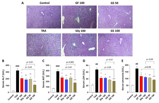 Co-treatments of GF and silymarin ameliorate TAA-injected hepatic injury. (A) Histopathological analysis of H&E staining. Serum levels of liver enzymes include ALT (B), AST (C), LDH (D), and ammonia (E). Data were expressed by mean ± S.E.M. ## p < 0.01 and ### p < 0.001 for Control vs. TAA. * p < 0.05, ** p < 0.01, and *** p < 0.001 for TAA vs. drug treatments (n = 3 for H&E staining, n = 6–8 for biochemistry analysis). Images were captured by light microscopy conditions (100× magnifications).