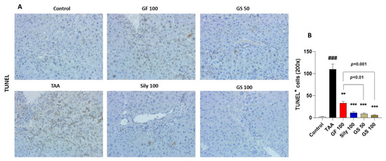 We further observed the cell death signals by application of the TUNEL assay. As we expected, TAA injection led to the enhancement of liver cell deaths in the liver tissues as compared with the control group; however, GS treatments remarkably reduced these signals of the TUNEL assay through the liver tissues (Figure 2A). Increased cell death induced by TAA was significantly decreased in the GS treatment than in the GF single treatment (p < 0.01 or 0.001 in Figure 2B).