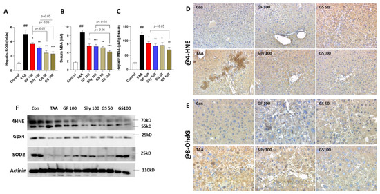 To verify the etiology of liver cell deaths during TAA injection of liver fibrosis, next, we investigated the oxidative stress-related molecules. As expected, hepatic ROS levels in the TAA group significantly increased as compared with the control group, whereas GS administrations synergistically decreased these alterations as compared with the GF 100 group (p < 0.01 and 0.05 for GS 50 and GS 100 in Figure 3A), respectively. Lipid peroxidations, which are the final products of oxidative stress, in the serum and hepatic protein levels were drastically elevated by TAA treatment as compared with the control group, respectively (p < 0.01 in Figure 3B,C); however, treatments with a high dose of GS significantly decreased them and they also exhibited remarkable effects as compared with each single treatment group (p < 0.05 in Figure 3B,C). IHC analysis by targeting against 4-HNE and 8-OHdG displayed that these oxidative stresses contributed well to hepatic injuries due to TAA injection, whereas GS groups notably decreased them (Figure 3D,E). Furthermore, antioxidant components in the liver protein levels of total GSH contents and SOD activities were reduced by TAA injection, while administrations with both GF and Sily significantly increased them and GS showed, synergistically, exertions of both antioxidant components compared with silymarin 100 mg/kg treatment (Supplementary Figure S2 p < 0.05, 0.01, and 0.001 relying on the dose-dependent manner).
