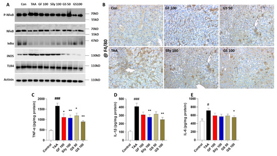 Anti-hepatic inflammation effects of GS by regulation of pro-inflammatory response. (A) Western blot analysis of the inflammation-related proteins. (B) Representative images of F4/80 in the liver tissue. (C) Hepatic protein levels of TNF-α, (D) IL-1β, and (E) IL-6. Data were expressed by mean ± S.E.M. # p < 0.05 and ### p < 0.001 for Control vs. TAA. * p < 0.05 and ** p < 0.01 for TAA vs. drug treatments (n = 4 for IHC analysis, n = 6–8 for biochemistry analysis, n = 4 for Western blot analysis). Images were captured by light microscopy conditions (100× magnifications).