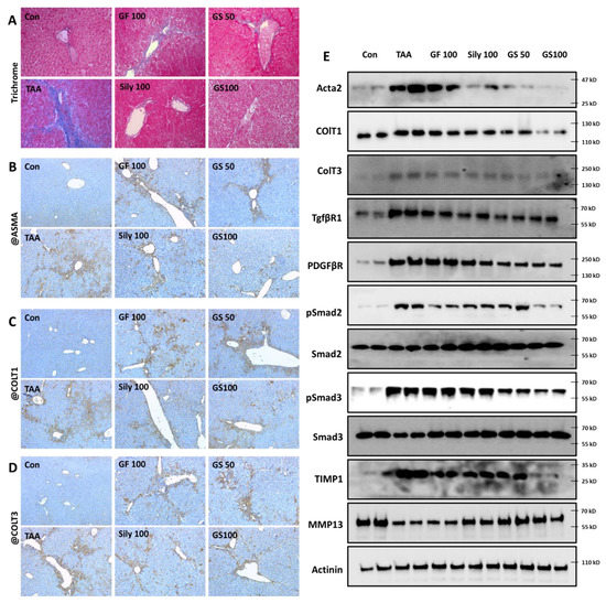 Our outcomes clearly exhibited the synergistic effects of GS on liver fibrosis as compared with each single treatment group. Trichrome staining, which is a marker of collagen deposition through liver tissues, showed that, as expected, GF100, Sily100, GS50, and GS100 significantly reduced collagens as compared with the TAA group (p < 0.05 or 0.01 in Figure 5A and Supplementary Figure S3A), and it is also showed that the GS100 group significantly decreased collagen depositions as compared with the GF100 group (p < 0.05 in Figure 5A and Supplementary Figure S3A). Moreover, ECM molecules including ASMA, ColT1, and ColT3, by evidence of IHC analysis, displayed the synergistic properties of GS better than other groups in a dose-dependent manner as compared with each single treatment group (p < 0.05 in Figure 5B–D and Supplementary Figure S3B–D), respectively. Western blot analysis data clearly provided the effects of GS against hepatic fibrotic molecules including ECMs (Acta2, ColT1, and ColT3), pro-fibrogenic cytokines receptors including TGF-β1R and PDGFβR, and their regulators of Smad2 and Smad3 activation, and modulators of ECM synthesis proteins, especially for TIMP1 and MMP13 with a synergistic manner, respectively (Figure 5E). Sirius Red staining supports the above results that our drug treatments significantly decreased collagen accumulations (Supplementary Figure S4A,B), and GS showed synergetic effects as compared with the GF 100 (p < 0.01).