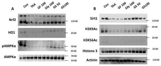 In the liver tissue, we further investigated the pharmacological actions of GS to explain the underlying mechanism of GS as compared with each single treatment group. Hepatic protein levels of Nrf2 were remarkably decreased in the TAA group and the Sily 100 group led to the recovery or prevention of the depletion of Nrf2 as compared with the TAA group. Both the GS 50 and 100 groups showed relatively increased Nrf2 in the hepatic protein levels as compared with the GF100, but not the Sily100 group (Figure 6A). HO-1 also supported the alterations in Nrf2 in the hepatic protein levels well (Figure 6A). We found AMPKα activation was drastically decreased in the TAA group; interestingly, both the GF and Sily 100 groups did not recover its activation but both doses of GS treatments notably recovered it (Figure 6A). Figure 6B shows the above alterations would be regulated by hepatic Sirt1 activations mainly by the synergistic manners of GS50.