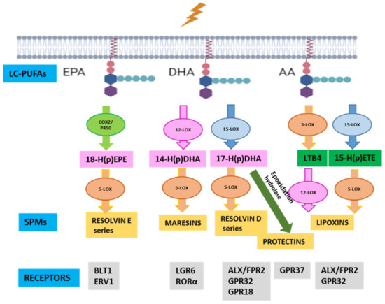 - Chiang, N.; Serhan, C.N. Structural elucidation and physiologic functions of specialized pro-resolving mediators and their receptors. Mol. Asp. Med. 2017, 58, 114–129. [Google Scholar] [CrossRef]