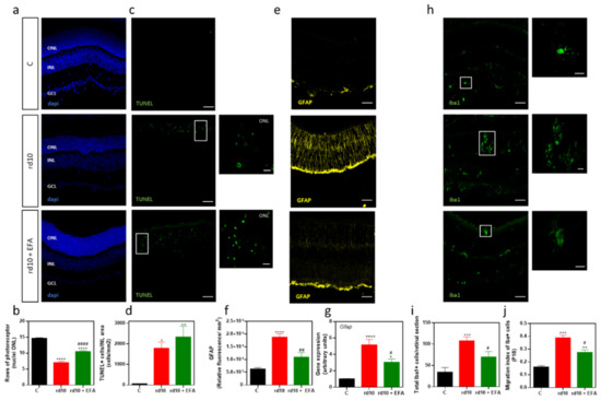 - Zhao, L.; Zabel, M.K.; Wang, X.; Ma, W.; Shah, P.; Fariss, R.N.; Qian, H.; Parkhurst, C.N.; Gan, W.B.; Wong, W.T. Microglial phagocytosis of living photoreceptors contributes to inherited retinal degeneration. EMBO Mol. Med. 2015, 7, 1179–1197. [Google Scholar] [CrossRef]