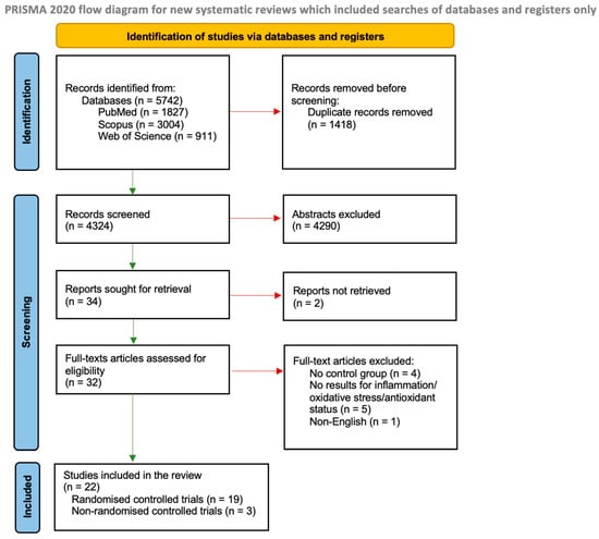 We identified 5742 studies through the database searches, and 1418 were duplicates (Figure 1). From 4324 records, we excluded 4290 based on abstracts and two due to the lack of access to the full-text version. A total of 32 full-text articles from the databases were assessed for eligibility. A total of twenty-two controlled trials met the inclusion criteria, of which nineteen were randomised and three were non-randomised.