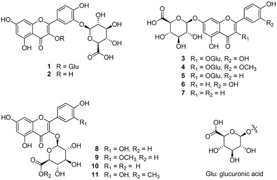 The leaves of P. chinensis were collected in August at Evada Botanical Garden (GPS coordinates: X: 126.926768 and Y: 37.2482236) and dried for extraction. Four flavonol-di-glucuronides (1 and 3–5), five flavonol-mono-glucuronides (2 and 8–11), and two flavone-mono-glucuronides (6 and 7) were isolated from the 30% ethanol extract of P. chinensis leaves (Figure 1) [13].