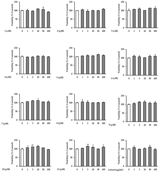 Effects of the extract and isolates on the viability of NHDFs. NHDFs were treated with the indicated concentrations of the extract and isolates for 24 h, and cell viability was evaluated using EZ-Cytox reagent kits. Data are presented as triplicate experiments. ## p < 0.01 and # p < 0.05 versus the non-treated group.