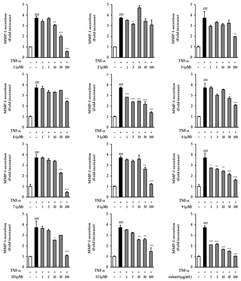 Next, we evaluated COLIA1 secretion in the TNF-α-treated condition. As shown in Figure 5, several compounds (1, 4, 5, 6, 9, 10, and 11) significantly increased COLIA1 secretion at different concentrations. However, the extract did not show an increase compared to that in the TNF-α-treated group. Compound 1 at 3, 10, and 30 µM potently increased COLIA1 secretion to 0.94 ± 0.02-fold (p < 0.001), 0.86 ± 0.09-fold (p < 0.001), and 0.77 ± 0.04-fold (p < 0.01), respectively, compared to the TNF-α-treated group (0.50 ± 0.00-fold, p < 0.001). In particular, 100 µM of compound 5 almost recovered the COLIA1 secretion by 0.96 ± 0.05-fold (p < 0.001).
