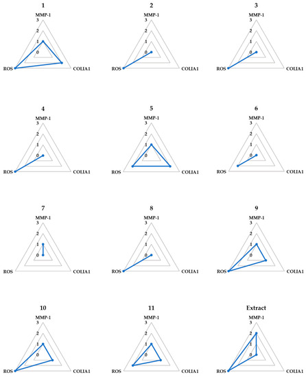 Spider chart for efficiency comparison of the isolates and extract on three markers associated with TNF-α-induced NHDF damage. The three markers included inhibition of MMP-1 secretion, inhibition of ROS generation, and stimulation of COLIA1 secretion. The scores assigned to the 12 tested samples ranged from three, representing the strongest effect, to one, indicating the lowest effect, for each factor. Additionally, a score of zero was assigned when no effect was observed for a particular factor.