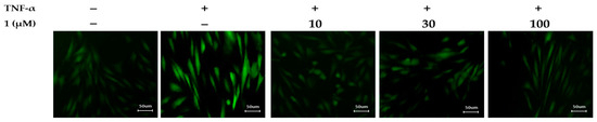 Effects of potentilloside A (1) on intracellular ROS generation in TNF-α-stimulated NHDFs. NHDFs were seeded in 48-well plate for 24 h. The medium was replaced with serum-free DMEM for serum-starved conditions to arrest the cell cycle. The cells were then treated with the indicated concentrations of 1 for 1 h. Subsequently, 20 ng/mL TNF-α and 10 µM DCFDA were added to each well for 15 min. Cells stained with DCF-DA were observed under a fluorescence microscope (×50).