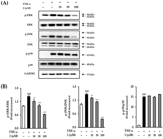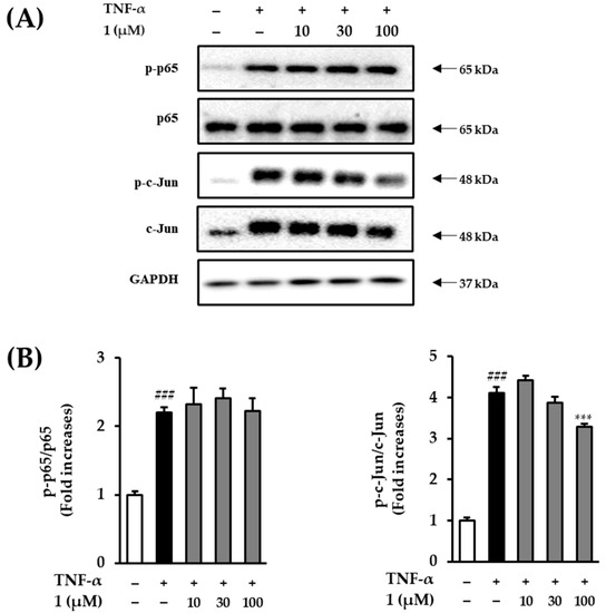 NHDFs were incubated in 6-well microplates (1.53 × 105 cells/well) in complete DMEM and incubated for 24 h (37 °C, 5% CO2). After incubation, cells were treated with 1 at concentrations of 10, 30, and 100 µM for 1 h. After 1 h, the cells were treated with 20 ng/mL of TNF- for 24 h. After 24 h, the cells were lysed by scraping with RIPA buffer to collect the proteins. The mixture was sonicated and centrifuged at 14,000 rpm for 10 min at 4 °C. The protein concentration was determined using BCA protein method. Proteins were separated using a 4–20% premade protein gel (SDS-PAGE) and transferred to PVDF membranes (Bio-Rad, Hercules, CA, USA). Membranes were blocked with 5% nonfat milk in Tris-buffered Tween20 for 1 h and incubated with primary antibodies (ERK 1/1000, JNK 1/1000, p38 1/1000, p65 1/1000, c-jun 1/1000, c-fos, and GAPDH cell signaling) overnight at 4 °C. Membranes were re-incubated with HRP-conjugated secondary antibody (Anti-rabbit 1/5000, Cell signaling, Danvers, MA, USA) for 1 h. Membranes were developed using an enhanced chemiluminescence (ECL) plus reagent (Bio-Rad, Hercules, CA, USA).
