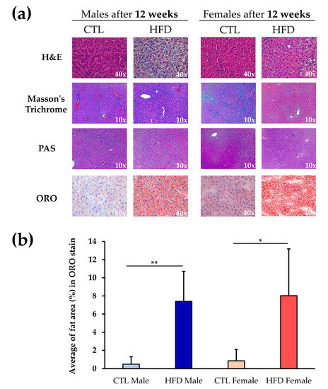 Liver histology in Wistar rats. (a) Liver sections stained with H&E, Masson’s Trichrome, PAS, and ORO stains at 10× or 40× magnification in male and female Wistar rats after 12 weeks of CTL or HFD diets. (b) ORO stain quantification with ImageJ2 software. Each bar represents the average fat area (%) in each experimental group. Significant differences in ORO stain were calculated by non-parametric Kruskal–Wallis test, * p < 0.05; ** p < 0.01 between CTL and HFD groups. Abbreviations: CTL, chow diet control group; H&E, hematoxylin and eosin; HFD, high-fat diet group; PAS, periodic acid–Schiff; ORO, oil red O.