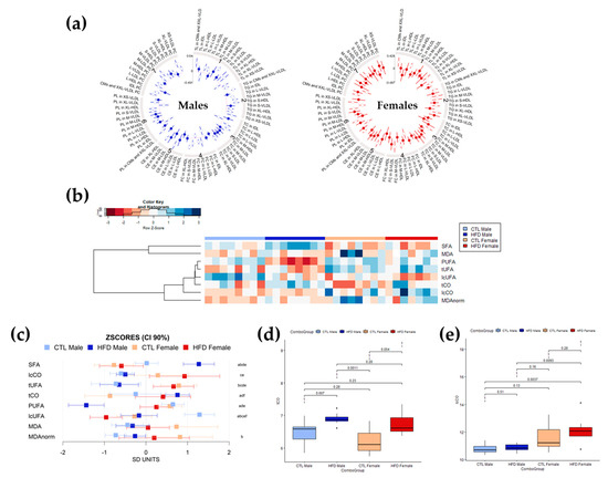 Profiling of lipoparticles and lipid structures in serum determined by NMR spectroscopy after 12 weeks of HFD. (a) Circos plot representing the mean differences for lipoparticle parameters in standard deviation units between CTL and HFD male (left, in blue) and female (right, in red) Wistar rats (filled and empty circles) and 95% confidence intervals (radial lines around the circle). Values closer to the center of the plot than the red line represent values higher for CTRL diet than HFD diet, whereas values farther from the center of the plot than the red line represent the opposite trend. Mean significant differences (p-value < 0.05) are represented with an empty circle, whereas non-significant mean differences are represented with a filled circle. (b) Heatmap and hierarchical cluster analysis of serum lipid moieties and MDA values (rows) for each sample (columns) showing which parameters have a similar trend for all samples in a group. Data have been mean-centered and normalized to the standard deviation for representation. Values higher than the mean appear in red, and those lower than the mean in blue. (c) Mean values and 90% CI expressed in SD units for lipid moieties and MDA in the different experimental groups. Multiple pairwise tests with statistical significance at p < 0.05 corrected for between-groups comparisons were labelled according to the following code: a, CTL male vs. HFD male; b, CTL male vs. CTL female; c, CTL male vs. HFD female; d, HFD male vs. CTL female; e, HFD male vs. HFD female; and f, CTL female vs. HFD female. (d,e) Box plots of circulating serum levels for carbonyls in (d) tCO and (e) lcCO showing specific differences and sample distribution between groups. Boxes denote interquartile range, lines denote median, and whiskers denote tenth and ninetieth percentiles. Statistically significant differences were established at p < 0.05. Abbreviations: CE, cholesteryl ester or esterified cholesterol; CI, confidence interval; CMs, chylomicrons; CTL, chow diet control group; HFD, high-fat diet group; lcCO, long chain carbonyl groups; lcUFA, long chain unsaturated fatty acids; FC, free cholesterol; HDL, high-density lipoproteins; IDL, intermediate-density lipoproteins; L, large size; LDL, low-density lipoproteins; M, medium size; MDA, malondialdehyde; MDAnorm, malondialdehyde data normalized; PC, phosphatidylcholine; PL, phospholipid; PUFA, polyunsaturated fatty acids; S, small size; SFA, saturated fatty acids; TC, total cholesterol; tCO, total carbonyl groups; TG, triglyceride; TL, total lipids; tUFA, total unsaturated fatty acids; VLDL, very-low density lipoproteins; XL, extra-large size; XS, extra-small size; XXL, extra-extra-large size.