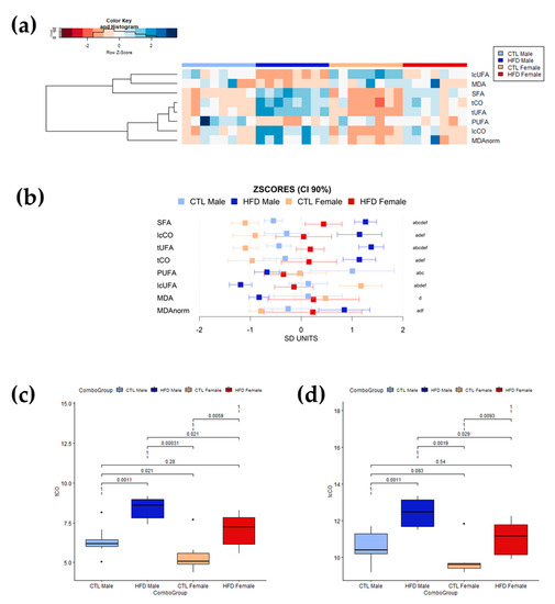 A change in the relative levels of the different lipid structures detected by NMR was observed after 12 weeks of HFD. In general, changes were greater in male than in female Wistar rats (Figure 2a). Lipoparticle profiles in serum were affected by 12 weeks of HFD, exhibiting global increases in particle number except for HDL particles in male and female Wistar rats. The main increases were reflected in triglycerides content, in VLDL particles and LDL particles, with some decreases in esterified cholesterol (CE) in HDL particles (significant differences marked with an empty circle) (Figure 2a). The cluster-arranged heatmap of the serum lipid spectral region levels for each animal (Figure 2b) showed decreases in unsaturations and increases in carbonyl content in lipid after 12 weeks of HFD, with strong effects in males and moderate to negligible effects in females. After 12 weeks of HFD, female Wistar rats showed higher levels of carbonyls in long-chain fatty acids (lcCO), long-chain unsaturated fatty acids (lcUFA) and polyunsaturated fatty acids (PUFAs), whereas male Wistar rats had higher levels of saturated fatty acids (SFAs), total carbonyls in lipids (tCO), and total UFAs (tUFA). CTL and HFD male Wistar rats showed evident differences. HFD male rats presented lower levels of PUFAs and tUFA and slightly higher levels of SFA and tCO compared to CTL males. Focusing on CTL and HFD females Wistar rats, the HFD females presented lower levels of lcUFAs and slightly higher levels of tCO and lcCO compared to CTL females. Lipid peroxidation measured by MDA did not show statistically significant differences associated with HFD in any group (Figure 2b). The 90% confidence intervals (CI) of the z-scores of the different moieties for each group (Figure 2c) further supported the changes observed in the heatmap and demonstrated that although following the same direction as male Wistar rats, most changes observed in female Wistar rats were of lesser intensity. The exception to this trend was carbonyl groups in lipids (tCO and lcCO), in which the change was more pronounced in females than in male Wistar rats. Boxplots of tCO (Figure 2d) showed statistically significant differences only between CTL and HFD male Wistar rats (p = 0.007 < 0.05), although the boxplots displayed high overlapping. However, lcCO (Figure 2e) showed significant differences between HFD male and HFD female Wistar rats (p = 0.0093 < 0.05), with lcCO levels being higher in HFD females. Interestingly, in both spectral regions, the dispersion of values was higher in female rats than in male rats, with wider boxes and larger standard deviations.