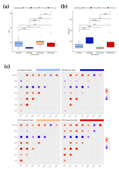 MDA is a reactive molecule formed as a byproduct of lipid peroxidation, a process in which UFAs in cell membranes are attacked by ROS, leading to lipid degradation. To further explore the interactions between oxidative stress and lipid moieties, MDA was quantified in serum and liver extract (Table 2). There was no statistically significant increase in serum MDA values among the experimental groups. Nevertheless, there was a statistically significant decrease in liver MDA values of HFD males. Moreover, the difference between HFD males and HFD females was also statistically significant. As the only statistically significant differences were seen in liver MDA values, these liver MDA values were represented in a boxplot (Figure 4a). To explore the potential effect of unsaturation amounts on measurements, we normalized the liver MDA value to total liver unsaturations (MDAnorm) (Figure 4b), observing a statistically significant (p = 0.021 < 0.05) increase in liver MDAnorm of HFD males compared to CTL males. Next, serum MDAnorm was calculated, but there were still no differences after 12 weeks of HFD, suggesting a potential increase in lipid peroxidation associated with subclinical fatty liver. The correlation matrices between liver lipid moieties and liver MDA values for each group showed a reduction in the amount and number of significant correlations after HFD, except for MDA correlations in female rats after 12 weeks, which became stronger (Figure 4c). Although the interpretation of these results is complex, HFD appears to induce dysregulation of lipid metabolism in male rats, whereas females have some kind of protection mechanism that helps maintain these correlations.