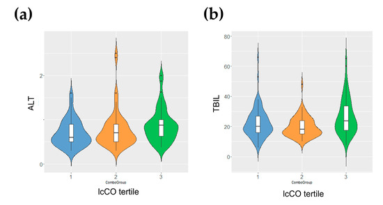 The characterization of the Piancavallo cohort composition and metabolic characteristics appears in Table 3. The obese patient population (BMI ≥ 40 kg/m2) was around 54.5 ± 14.4 years old, and it was composed of a higher proportion of females (n = 192) than males (n = 72). There were not significant differences in biochemical parameters (glucose, LDL, HDL, triglycerides, ALT and TBIL). The selected population was in a borderline or minor grade of IR status. Given that these patients came from a cohort of extremely obese patients, we considered the selected patients for this study as not insulin resistant. Carbonyls showed statistically significant differences in both the serum and liver samples from Wistar rats measured by NMR. Due to their importance and their potential to be used as biomarkers of changes in lipid moieties and lipid structures, carbonyls were analyzed in the human cohort of obese patients to determine the association of their tertiles with liver function biochemical parameters (ALT and TBIL) (Figure 5). We found that obese individuals in the highest tertile of lcCO also exhibited moderately high levels of ALT (Figure 5a) and total bilirubin (TBIL) (Figure 5b).