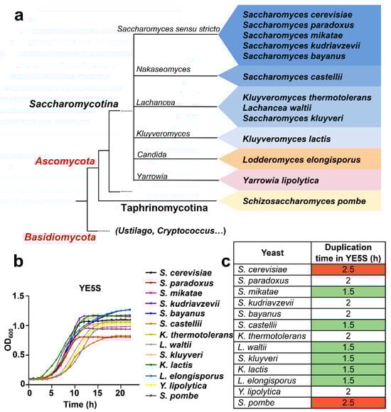 We first tested whether a common rich media would sustain the growth of the different yeasts with comparable duplication times and maximal cell densities. We recorded the growth curves in 96-well plates under shaking at 30 °C of the 13 yeasts in S. pombe rich medium (YE5S) [29], S. cerevisiae YPD medium [30], and a modified, custom rich YPD [19]. As shown in Figure 1b (growth in YE5S) and Figure S1 (growth in YPD and custom rich YPD), yeasts displayed similar kinetics in all media, with YE5S allowing more homogeneous behaviors regarding maximal optical densities and duplication times. As shown in Figure 1c, S cerevisiae and S. pombe displayed the longer duplication times in YE5S (in red in Figure 1c; 2.5 h), while six yeasts species doubled almost twice as fast (in green in Figure 1c; 1.5 h).