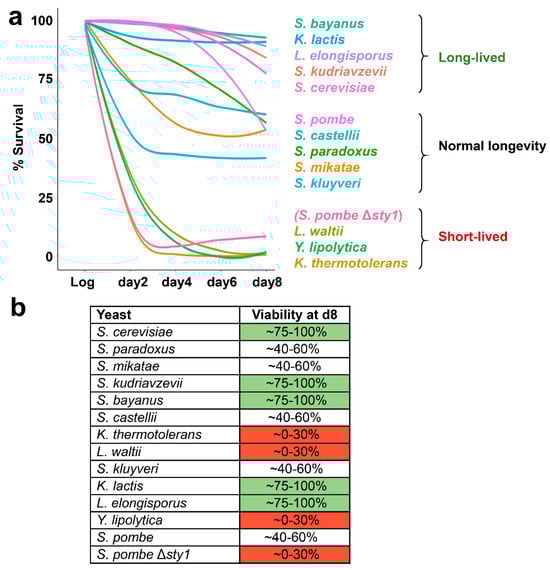 In general, the initial decay of survival at day 2 and the low viability at day 8 were concomitantly affected for each yeast type. We classified the 13 species in three groups, based on their viability at day 8: long-lived (~75–100% survival; in green in Figure 2b), displaying normal longevity (using wild-type S. pombe as a reference; ~40–60% survival), and short-lived (using Δsty1 S. pombe as a reference; ~0–30% survival; in red in Figure 2b).