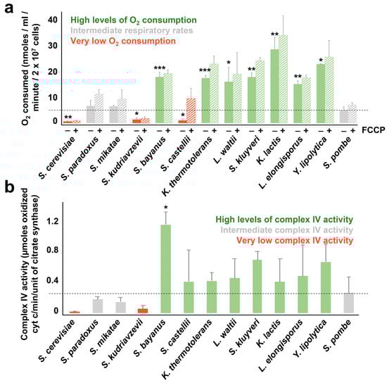 Measuring mitochondrial activity with two different approaches. (a) Mitochondrial oxygen consumption of whole cells showed differences in the respiratory rates of the 13 species. Oxygen consumption levels were measured in cells growing in YE5S when cultures reached an OD600 of 0.5. Bars represent the mean and SD from three biological replicates. Significant differences relative to S. pombe were determined by two-sided t-test (* p < 0.05, ** p < 0.01, *** p < 0.001). Maximal respiratory capacity upon addition of the uncoupler FCCP is also shown. Yeast with significantly high or low respiratory rates are highlighted in green or red, respectively. (b) Complex IV activity assay of isolated mitochondria. Cytochrome c oxidation was monitored at 550 nm and referenced to citrate synthase units as described in Section 2. Yeast with high, intermediate or low complex IV activity are highlighted in green, grey or red, respectively. Bars represent mean and SD from biological duplicates. Significant differences relative to S. pombe were determined by two-sided t-test (* p < 0.05).