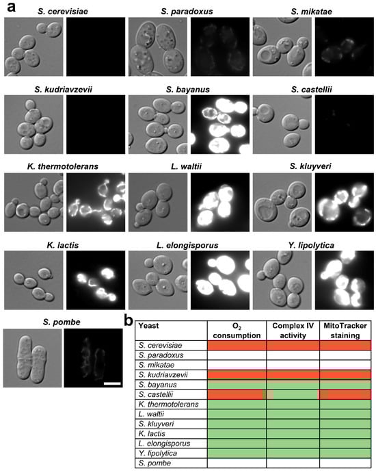 We also monitored the complex IV activity of mitochondrial-enriched fractions of the different yeasts by measuring cytochrome c oxidation. We first normalized the mitochondrial fractions by measuring citrate synthase activity (Figure S3b). As shown in Figure 3b, complex IV activity from purified mitochondria yielded similar results to those obtained with measurement of oxygen consumption of whole cells (Figure 3a). Thus, it was evident that mitochondria fractions of S. cerevisiae and S. kudriavzevii displayed very low levels of cytochrome c oxidation (in red in Figure 3b), while S. paradoxus, S. mikatae, and S. pombe mitochondria had intermediate levels of complex IV activity (in grey in Figure 3b). Seven yeasts’ mitochondria displayed very high levels of cytochrome c oxidation (in green in Figure 3b), as they also displayed high levels of oxygen consumption (Figure 3a). The only yeast showing different results using both methods was S. castellii: it displayed undetectable levels of oxygen consumption, but high levels of complex IV activity. Since the second method involves the isolation of the mitochondria-enriched fraction, we hypothesized that a repressive factor acting in whole cells is eliminated in the purified S. castellii mitochondria. In fact, this yeast displayed a remarkable difference in oxygen consumption in the presence or absence of FCCP (Figure 3a).