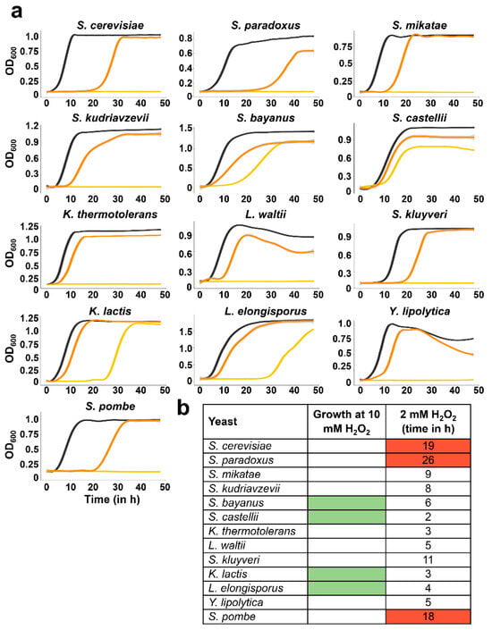 Analysis of tolerance to H2O2 in liquid cultures. (a) Yeasts were grown in YE5S in the absence (dark grey) or presence of 2 mM (orange) or 10 mM (yellow) H2O2. Growth rates were monitored by measuring the OD600 during 48 h. Each line represents the average of three independent replicates and grey shadows indicate the SD. (b) Table summarizing tolerance to peroxides. Second column indicates the resistant strains capable of resuming growth in the presence of 10 mM H2O2 treatment (marked in green). Third column indicates the time (in hours) each yeast needs to recover after 2 mM H2O2 treatment; in red: the three strains more sensitive to H2O2 stress.