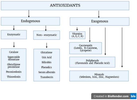 The main source of exogenous antioxidants is diet. There are three categories of exogenous, non-enzymatic antioxidants: first are mineral elements such as selenium and zinc; the second is carotenoids, vitamin E and vitamin C; and the third category is phytochemicals/phytonutrients such as flavonols (quercetin, kaempferol and myricetin), isoflavones (genistein, daidzein and glycitein), flavanones (naringenin, eriodictyol and hesperetin), and phenolic acids such as chlorogenic acid, gallic acid and caffeic acid [12].