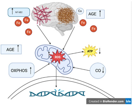 The role of oxidative stress in the pathogenesis of Alzheimer’s disease. ROS: reactive oxygen species. ATP: adenosine triphosphate. NFκB: nuclear factor-kappa B. OXPHOS: nuclear-encoded oxidative phosphorylation subunits. AGE: advanced glycation products. CO: cytochrome c oxidase. Fe: iron ions. Cu: copper ion. ↑ level/activity increase, ↓ decrease in level/activity. Aβ plaques and hyperphosphorylated tau protein tangles play an essential role in the pathogenesis of Alzheimer’s disease. They are most likely involved in generating ROS. Overproduction of ROS can cause permanent DNA damage. The main source of ROS is the mitochondria. ROS can lead to mitochondrial dysfunction, such as decreased ATP levels. Another effect of oxidative disorder is the accumulation of AGE. AGE were noted to be present in Aβ plaques. NFκB activation may be involved in hyperphosphorylation of the tau protein. In Alzheimer’s disease, OXPHOS genes are overexpressed, resulting in increased production of ROS. CO is one of the key elements of mitochondrial metabolism. In Alzheimer’s disease, reduced CO activity is observed with an increase in ROS levels. It is also indicated to shorten the metabolism of metals, e.g., Fe, Cu ions. Disturbances in metabolism can lead to increased production of ROS. The presence of Fe was demonstrated near Aβ plaques and tau protein tangles. Cu, just as Fe, can colocalize with Aβ.