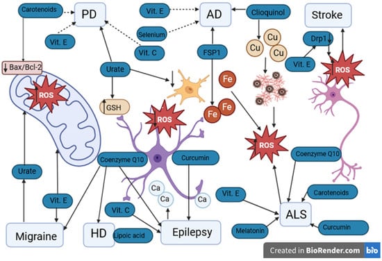 Potential antioxidants used in neurological diseases. PD: Parkinson’s disease. AD: Alzheimer’s disease. HD: Huntington’s disease. ALS: amyotrophic lateral sclerosis. Vit. E: vitamin E. Vit. C: vitamin C. ROS: reactive oxygen species. GSH: glutathione. FSP1: ferroptosis suppressor protein 1. Drp1: dynamin-related protein 1. Fe: iron ions. Cu: copper ions. Ca: calcium ions. ↑ level/activity increase, ↓ decrease in level. Urate has a protective effect on PD by increasing the concentration of GSH in astrocytes and reducing oxidative stress and inflammation in microglia. The protective effect of vitamins E and C in PD remains debatable. In AD, the protective effect of FSP1 occurs by the chelation of Fe ions and clioquinol by the chelation of Cu. The protective effect of vitamin E and selenium in AD has not been confirmed. In ischemic stroke, elevated levels of Drp1 may lead to the death of nerve cells. Decreased levels of Drp1 are noticeable with antioxidants such as vitamin E. Both in migraine and epilepsy, ALS and HD, the protective effect of antioxidants such as vitamins C and E, coenzyme Q10, melatonin, and curcumin is indicated. However, their protective effect requires further research.