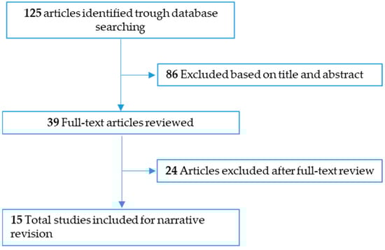 This narrative literature review was carried out from November, 2022 to August, 2023. Relevant English-language articles were reviewed through searches in PubMed and Web of Sciences using the key words “gestational diabetes”, “oxidative stress”, “inflammation” and “human”. For the description of oxidative stress and inflammation in GDM, the literature search focused primarily on observational studies that assessed oxidative stress and inflammation biomarkers simultaneously. For the description of effects of supplementation on oxidative stress and inflammation biomarkers, the literature search focused on double-blind placebo-controlled randomized clinical trials (RCTs) investigating the role of probiotics and nutrient supplementation in maternal biomarkers of oxidative stress and inflammation and in in vitro models of GDM. We excluded studies that involved animals. The search resulted in a total of 125 articles (Figure 1), which were assessed by title first and abstract second, as per our predetermined eligibility criteria. Articles whose title and abstract matched these criteria were then examined. Ultimately, 15 articles were eligible and were included.