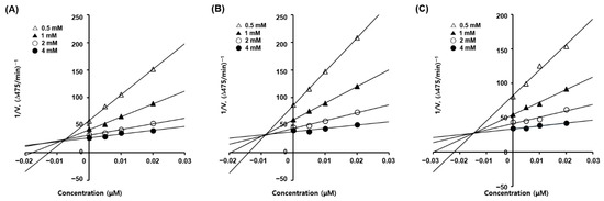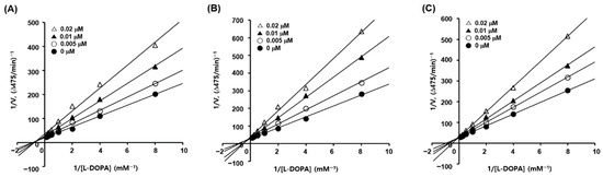 Lineweaver–Burk plots for the mushroom tyrosinase inhibition of analogs 4 (A), 6 (B), and 10 (C). Seven different concentrations (0.125, 0.25, 0.5, 1, 2, 4, and 8 mM) of l-dopa as a substrate, and four different concentrations (0, 5, 10, and 20 nM) of each analog were used for kinetic studies.