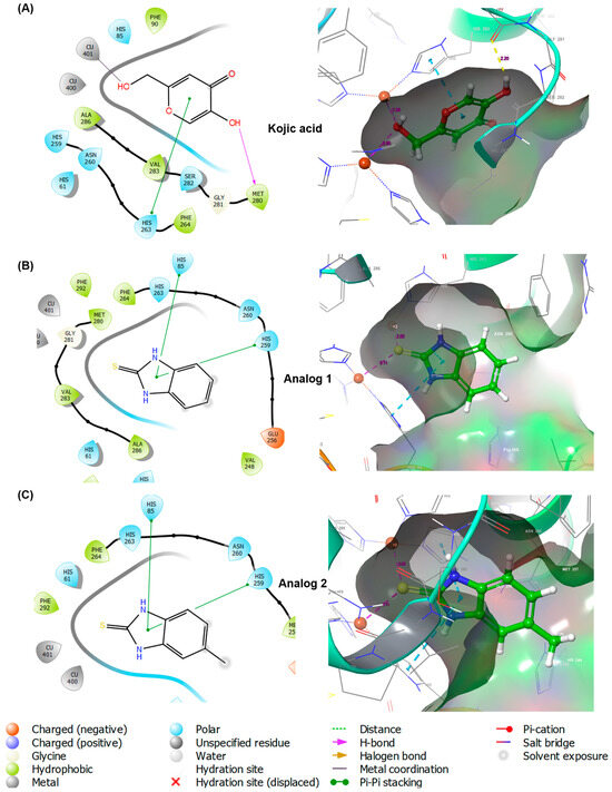 Docking simulation of kojic acid (A), analog 1 (B), and analog 2 (C) and mushroom tyrosinase (Protein Data Bank (PDB) ID: 2Y9X) using Schrodinger Suite. Binding interactions between ligands and amino acid residues of tyrosinase are shown in three-dimensional (3D) and two-dimensional (2D) formats.