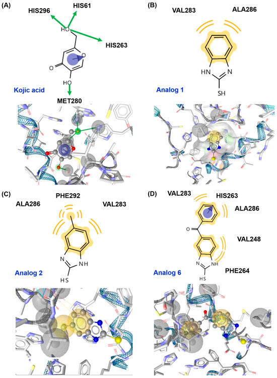 In the in silico docking simulation using AutoDock Vina, kojic acid interacted with tyrosinase via three interactions: pi–pi stacking between the 4-pyranone and His263 and two hydrogen bonds between the 5-hydroxyl and Met280 and between the 2-hydroxymethyl and three amino acids (His61, His263, and His296), providing the binding affinity of −5.4 kcal/mol (Figure 4). For analog 1, the benzene ring of the 2-MBI ring interacted with two amino acids, Val283 and Ala286, via hydrophobic interactions, giving a binding affinity of −5.5 kcal/mol, similar to that of kojic acid. Analog 2 generated three hydrophobic interactions: the benzene ring of the 2-MBI ring in 2 interacted with Val283 and Ala286, similar to analog 1, and the methyl substituent formed a hydrophobic interaction with Phe292. These interactions provided a binding affinity of −5.3 kcal/mol, similar to kojic acid. In 6, the benzene ring of the 2-MBI ring and the phenyl ring of the benzoyl group participated in hydrophobic interactions. The benzene ring of the 2-MBI ring interacted with Val248 and Phe264, and the phenyl ring of the benzoyl group interacted with Val283 and Ala286. In addition, the phenyl ring in 6 formed pi–pi stacking with His263. These interactions provided analog 6 with the strongest binding affinity of −7.5 kcal/mol, consistent with the inhibition of mushroom tyrosinase activity.