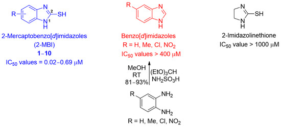 Chemical structures of 2-mercaptobenzo[d]imidazoles (2-MBI), benzo[d]imidazoles, and 2-imidazolinethione, their IC50 values, and the synthetic method for four benzo[d]imidazole derivatives.