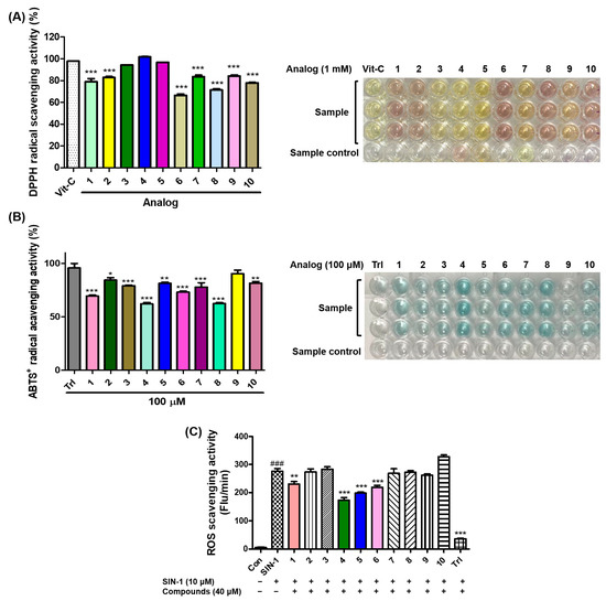 The effects of analogs 1–10 on scavenging activities of 2,2-diphenyl-1-picrylhydrazyl (DPPH) radicals (A), 2,2′-azino-bis(3-ethylbenzothiazoline-6-sulfonic acid (ABTS) radical cations (B), and the in vitro reactive oxygen species (ROS) (C). (A) Vitamin C (Vit-C) was used as the positive control for activity comparison, and the radical scavenging experiments of all test samples were performed at 1 mM. (B) Test samples (1–10) and Trolox (Trl), a positive control, were used at 100 μM. (C) Trolox (Trl) and 3-morpholinosydnonimine (SIN-1) were utilized as the positive control and ROS generator, respectively. All test compounds were used at 40 μM. The scavenging results are presented as the mean ± standard errors of the mean (SEM) of three different experiments. ### p < 0.001 vs. untreated control, *** p < 0.001, ** p < 0.01, and * p < 0.05 vs. Vit-C-treated group for (A), vs. Trl administration group for (B), and vs. SIN-1-treated group.