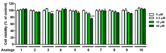 Cell viability of analogs 1–10 in human embryonic kidney cells (HEK-293) at the 24 h storage time point. An EZ-Cytox assay method was used at four test sample concentrations (0, 2.5, 10, and 40 µM). ** p < 0.01 and *** p < 0.001 vs. untreated control group.