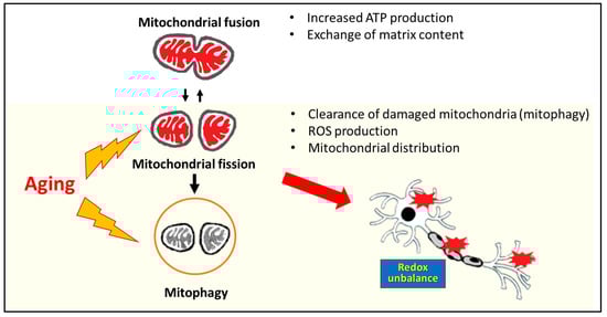 Mitochondrial dynamics (fission, fusion, transport, and mitophagy) are important in cellular functions, such as energy production, cell division, cell differentiation, and cell death. Aging (yellow area) increases mitochondrial fission and impairs mitophagy formation, leading to changes in mitochondrial dynamics and redox unbalance by the increase of oxidative stress and contributing to cell apoptosis. Mitochondria have been thought to contribute to aging through the accumulation of mitochondrial DNA (mtDNA) mutations, which result in respiratory chain deficiencies and increased ROS generation. Increased oxidative stress encourages the oxidation of macromolecules and causes neuronal cell apoptosis.