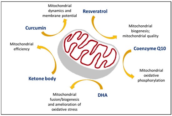 Moreover, the maintenance of mitochondrial function is another therapeutic approach for AD. Supplementation with nutraceuticals (curcumin, resveratrol, Coenzyme Q10, docosahexaenoic acid (DHA)) or ketone body treatment could boost mitochondrial functions []. Curcumin enhanced neuroplasticity and improved mitochondrial dynamics and membrane potential []. The administration of CoQ10 could improve mitochondrial function by altering the flow of calcium []. Resveratrol could upregulate SIRT1, ERK, and AMPK (PGC-1α) signaling to further contribute to mitochondrial functions and improve neuronal renewal []. DHA plays an antioxidant role and increases mitochondrial fusion, inhibits mitophagy, or promotes biogenesis due to an increase of p62, OPTN, PINK1, and PGC-1α []. The effects of nutraceutical supplementation on mitochondria are summarized in Figure 3 and Table 2.