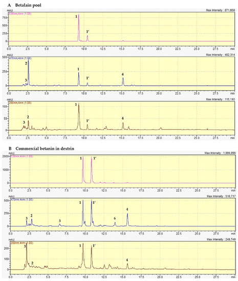 Comparative RP-HPLC-DAD chromatograms of major betalains detected at 536 nm (pink peaks), 470 nm (blue peaks), and 280 nm (brown peaks) from betalains pool (A), commercial betanin in dextrin (B) and purified betanin (C) 1—betanin, 1’—isobetanin, 2—vulgaxanthin, 3—sucrose, 4—neobetanin, 5—2,15-bidecarboxy-xanbetanin, 6—17-decarboxy-betanin. Chromatographic conditions: mobile phase A—water/formic acid (99/1 v/v%), mobile phase B—methanol/water (80/20 v/v%), flow rate at 3.5 mL/min.