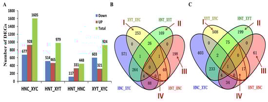 Analysis of DEGs identified in the four treatment comparisons. (A) Total number of DEGs identified in each comparison group based on expression type. Up-regulation means increased expression of the DEG, whereas down-regulation means reduced expression of the DEG; color representation: red—up-regulated and blue—down-regulated. (B) Venn diagram analysis of up-regulated DEGs. (C) Venn diagram analysis of down-regulated DEGs. The overlapping area of the Venn diagram indicates that there is an overlap in DEGs between the corresponding groups. Region I shows DEGs specifically expressed in XYT_XYC in response to low-N stress, region II contains DEGs uniquely expressed in HNT_HNC under low-N stress, and region IV shows DEGs overlapping between two hybrid lines under low-N stress.