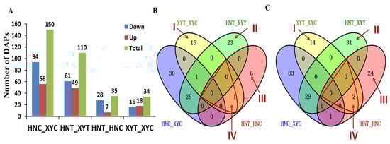 Analysis of differentially abundant proteins (DAPs) identified in four experimental comparisons. (A) Number of DAPs identified in each experimental comparison group. Up-regulation-means an increase in the abundance of a DAP. Down-regulation-refers to a DAP with reduced differential abundance; red: up-regulated and blue: down-regulated. (B) Venn diagram analysis of up-regulated DAPs. (C) Venn diagram analysis of down-regulated DAPs. The overlapping areas of the Venn indicate that there is a DAP overlap between the corresponding groups. Region I shows DAPs specifically expressed in XYT_XYC in response to low-N stress; region II shows DAPs uniquely expressed in the XYT_HNT comparison in response to low-N stress; region III contains DAPs uniquely expressed in HNT_HNC under low-N stress; region IV shows DAPs overlapping between two hybrid lines under low-N stress.