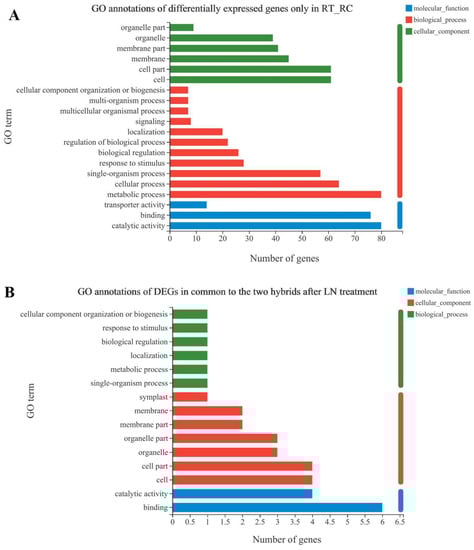 GO annotation of specifically expressed genes, in the low-N-tolerant hybrid XY335 under low-N treatment (A); and, commonly shared between the two hybrids under low-N treatment (B). The vertical axis in the figure represents the secondary GO classification terms, the upper horizontal axis represents the percentage of genes or transcripts included in the secondary classification, and the lower horizontal axis represents the number of genes/transcripts in the secondary classification in the alignment; the three colours represent the three categories.