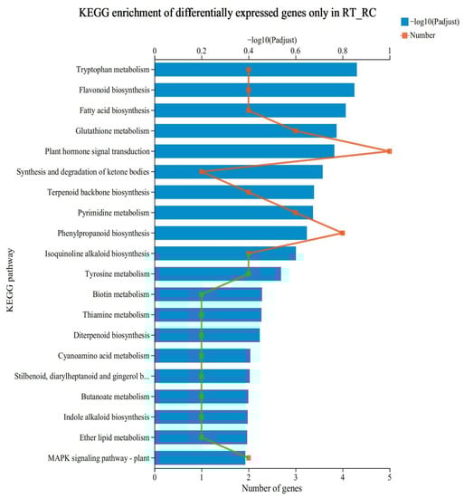 KEGG functional enrichment analysis of DEGs. The ordinate represents the enrichment results of the first 20 KEGG pathways and the lower abscissa represents the number of DEGs in the pathway compared, corresponding to different points on the polyline. The upper abscissa represents the significance level of enrichment, corresponding to the height of the column; the smaller the FDR is and the larger the −log10(p adjust) value is, the more significantly enriched the KEGG pathway is.