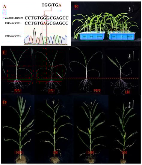 Phenotypic characterization of the WT and mutant plants under low-N stress. The phenotypes presented here are for maize at the seedling and grain filling stages treated with N deficiency. (A) The stop codon induced by EMS results in a truncated protein. (B) Phenotype control of WT and mutant plants under normal-N (NN) and low-N (LN) treatments at the seedling stage. (C) The individual plant phenotype control of WT plant and mutant under normal-N and low-N treatments at the seedling stage. (D) The individual plant phenotype control of WT plant and mutant under normal-N and low-N treatments at the grain filling stage. From left to right, (C,D) are normal-N-treated B73, low-N-treated B73, normal-N-treated mutant, and low-N-treated mutant. WT, wild type; Mutant, mutant; LN, low N; NN, normal N.