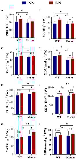 The effect of different N concentrations on the antioxidant enzyme activities and malonaldehyde (MDA) content in wild-type and mutant maize lines at the seedling and grain filling stages. (A–D) Seedling stage: (A) POD, (B) SOD, and (C) CAT activities and (D) MDA content. (E–H) Grain filling stage: (E) POD, (F) SOD, and (G) CAT activities and (H) MDA content. The values shown are means ± SE (n = 6). Significant differences between treatments were analysed using Tukey’s test, * p < 0.05, ** p < 0.01. Note: WT, wild type; ns, not significant; LN, low N; NN, normal-N conditions.