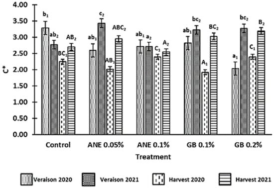 Chroma (C*) of berries of cv. ‘Touriga Franca’, with different treatments at veraison and harvests of 2020 and 2021. Values are means ± SE; different letters (lowercase—veraison; uppercase—harvest; 1—Year 2020; 2—Year 2021) mean significant differences between treatments within each phenological stage (p < 0.05, Tukey test). ANE—seaweed extract; GB—glycine betaine.