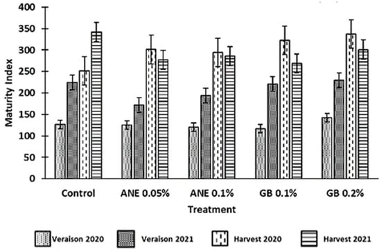 The maturity index (MI) is calculated using the TSS (°Brix) and the pH values, being generally used to determine the optimum ripeness of red wine grapes. In this study, it verified an increase in MI from veraison to harvest (Figure 3), which is expected as the total soluble solids of berries tend to increase in this maturation period. However, no differences between treatments were verified at the statistical level (p > 0.05). Consequently, the application of ANE and GB did not affect the maturity index. However, berries from grapevines treated with GB 0.2% showed the highest values of MI in the 2020 harvest and in the veraison of both years, which could indicate that these grapevines were in a more advanced phenological stage (Figure 3).