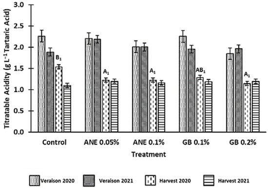 Statistically significant differences between treatments (p < 0.05) were only observed for the harvest of 2020, where there was a reduction in berry TA for all treatments, but especially in berries of GB 0.2% (about 34% lower compared to the C).