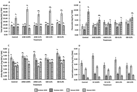 Variation on bioactive compound contents: total phenolics (A), flavonoids (B), ortho-diphenols (C), and total anthocyanins (D), in berries with different treatments in two consecutive years (2020 and 2021). Values are means ± SE; different letters (lowercase—veraison; uppercase—harvest; 1—Year 2020; 2—Year 2021) mean significant differences between treatments within each phenological stage of each year (p < 0.05, Tukey test), no letters mean no significant differences. ANE—seaweed extract; GB—glycine betaine.