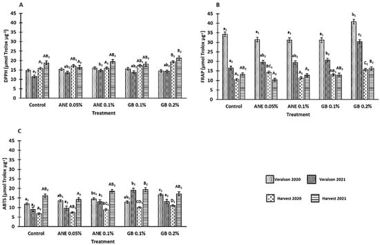 Antioxidant activity (AA): DPPH radical-scavenging activity (A), FRAP assay (B), and ABTS•+ radical-scavenging activity (C) in berries of cv. ‘Touriga Franca’, with different treatments in two consecutive years (2020 and 2021). Values are means ± SE; different letters (lowercase—veraison; uppercase—harvest; 1—Year 2020; 2—Year 2021) mean significant differences between treatments within each phenological stage of each year (p < 0.05, Tukey test), no letters mean no significant differences. ANE—seaweed extract; GB—glycine betaine.