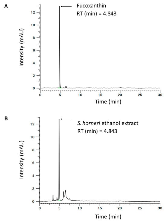 HPLC chromatogram of (A) fucoxanthin content in (B) Sargassum horneri ethanol extract (SHE).